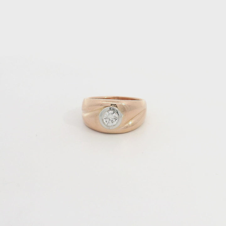 18ct rose and white gold diamond ring. The ring consists of 1 = 0.42ct F/SI round brilliant cut diamond set into 18ct white gold bezel set. Ring width 9.6mm tapering to 3.6mm. Total ring weight 9.1mm. Size M