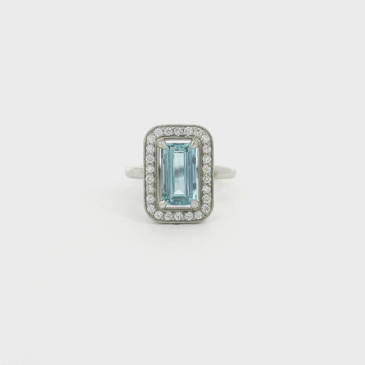 18ct white gold aquamarine & diamond ring. The ring consists of 1 = 2.32ct emerald cut aquamarine set into 4 claws. Surrounding the aquamarine are 34 round brilliant cut diamonds with a total weight of 0.48ct F/SI. Grain set, featuring mill grain edge.