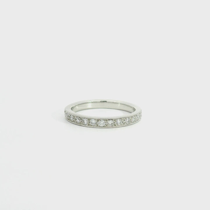 18ct white gold diamond band. The ring consists of 13 round brilliant cut diamonds with a total weight of 0.26ct FG/VS-SI. All diamonds are bead set and mill grain edging.