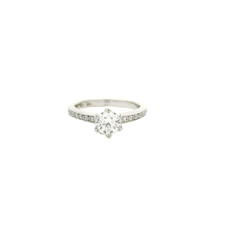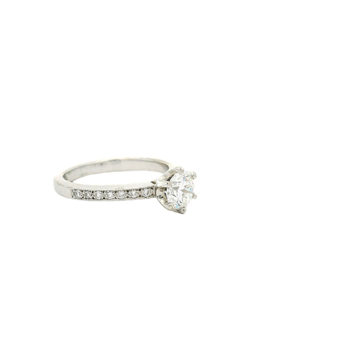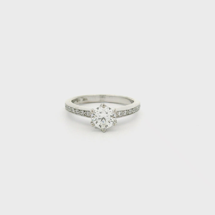 This traditional handmade 18ct white gold engagement ring features a certified 0.75ct round brilliant cut diamond, G in colour and SI1 in clarity. Elegantly grain set with 14 round brilliant cut diamonds within the shoulders, this engagement ring is classic in style and will be loved for generations to come.