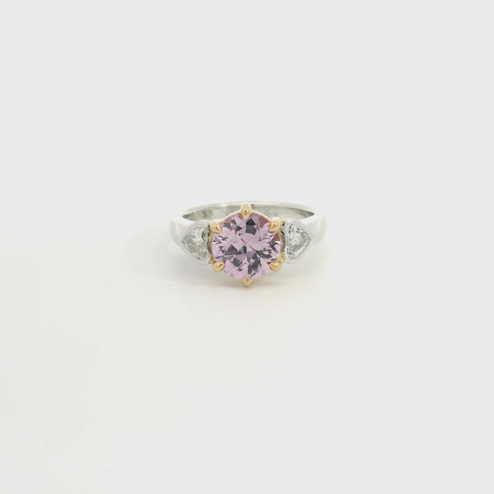 Handcrafted in 18ct white and rose gold pink sapphire & diamond ring. This unique ring consists of one round pink sapphire = 1.67ct set into 18ct rose gold 6 claw setting. Set on either side of the sapphire are 2 heart cut diamonds =0.45ct F/VVS-VS, set into 18ct white gold rub over settings.
