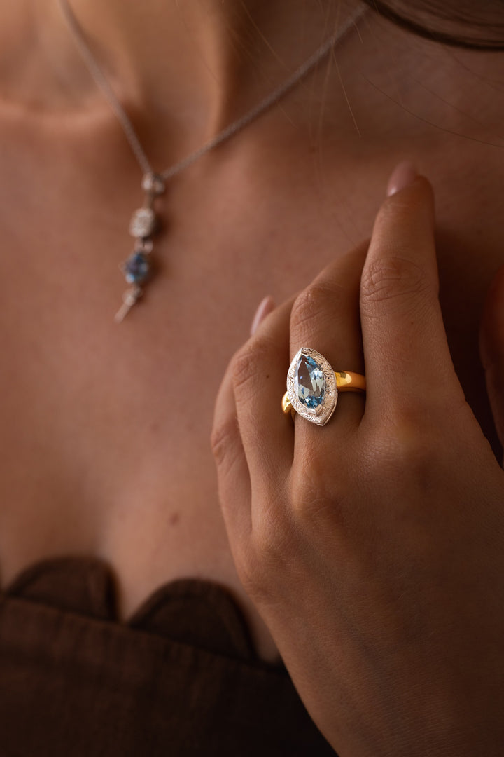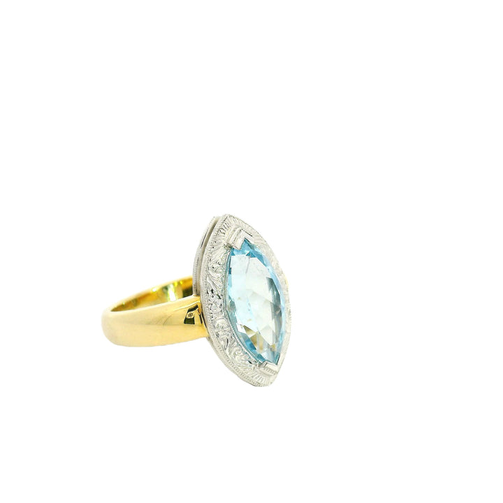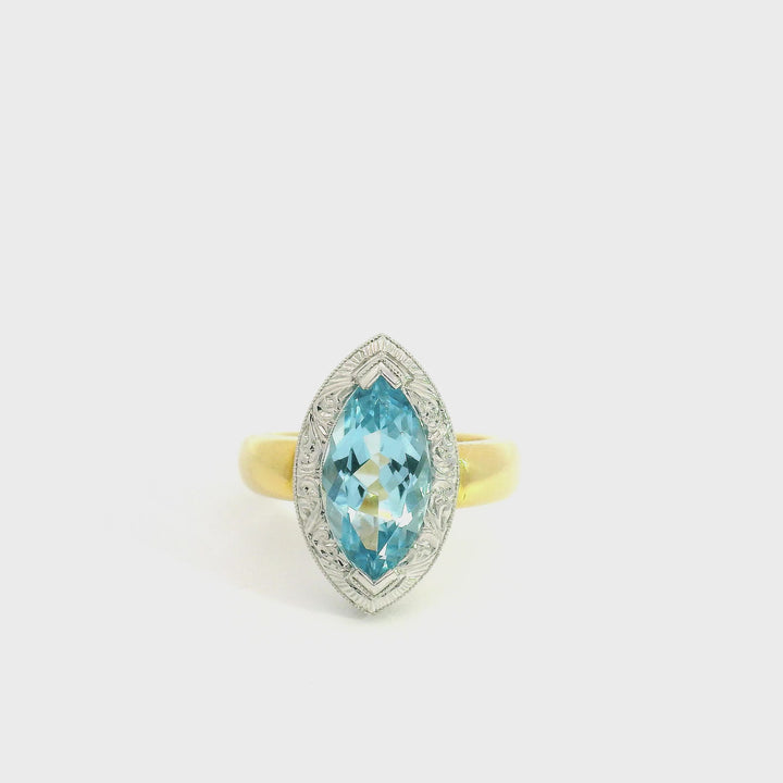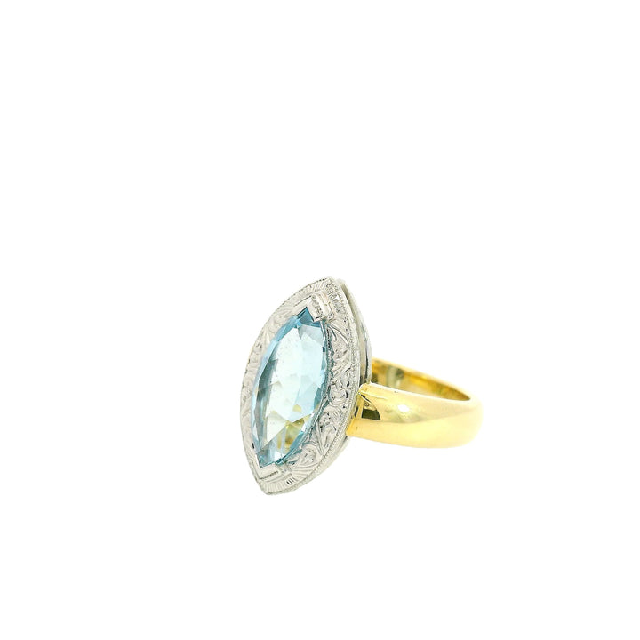 Elegantly framed with hand engraving, the 2.72ct marquise cut aquamarine holds the spotlight within this 18ct yellow and white gold dress ring. Handmade with the utmost precision and care, for you to enjoy wearing for a lifetime.