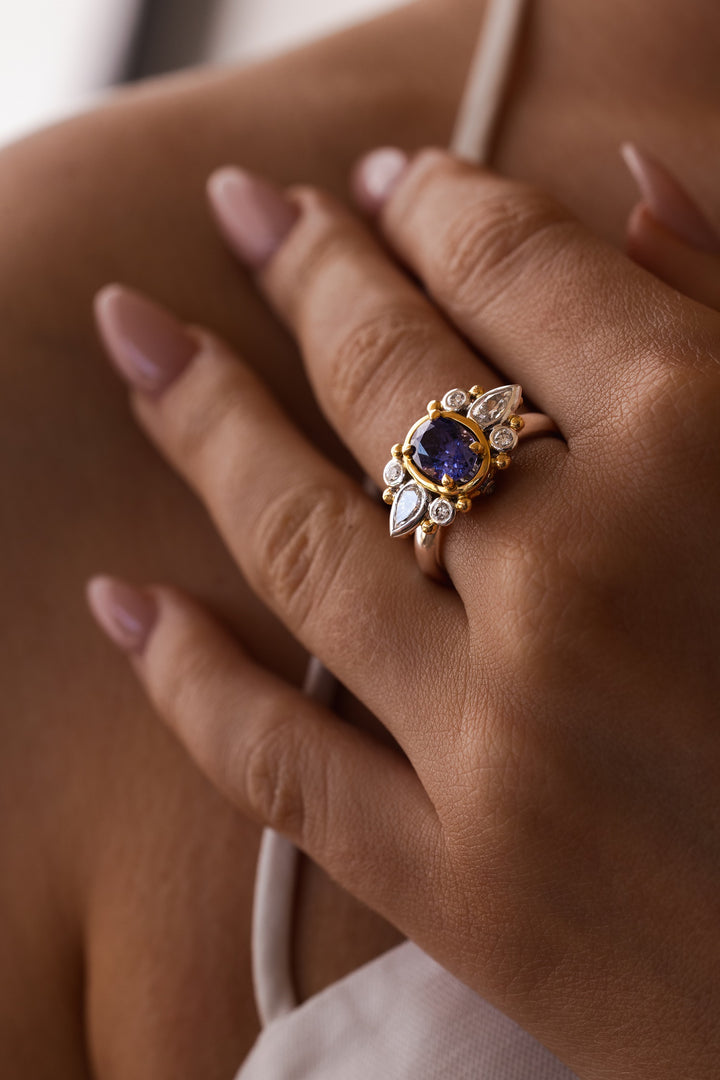This show-stopping 18ct yellow and white gold dress ring, will be the center piece of any outfit. Featuring an incredible oval shape Ceylon sapphire, weighing 1.74ct, and two side tear drop diamonds, weighing a total of 0.83ct. This dress ring displays uniqueness from every angle.