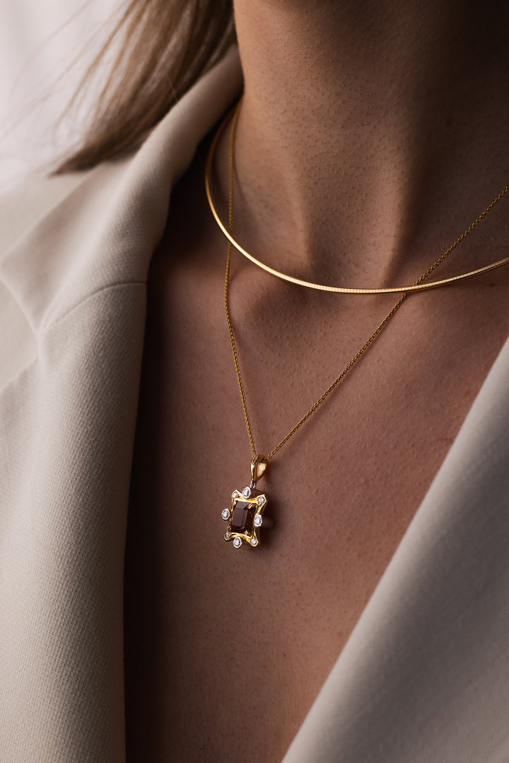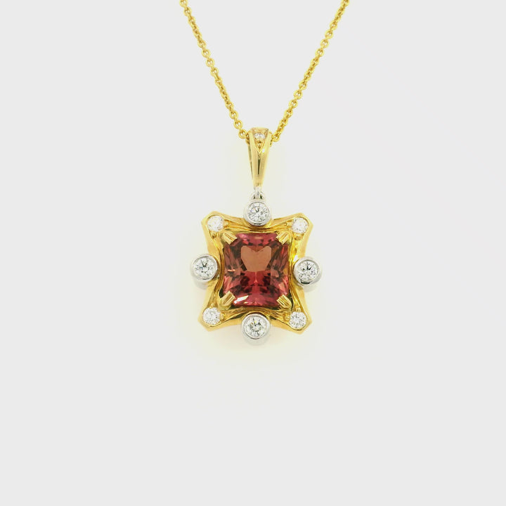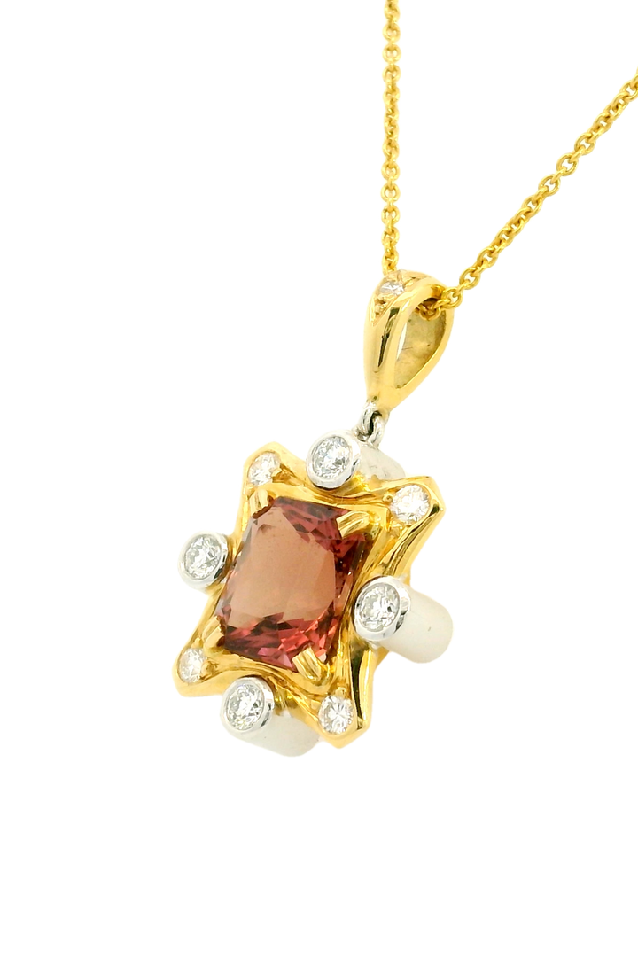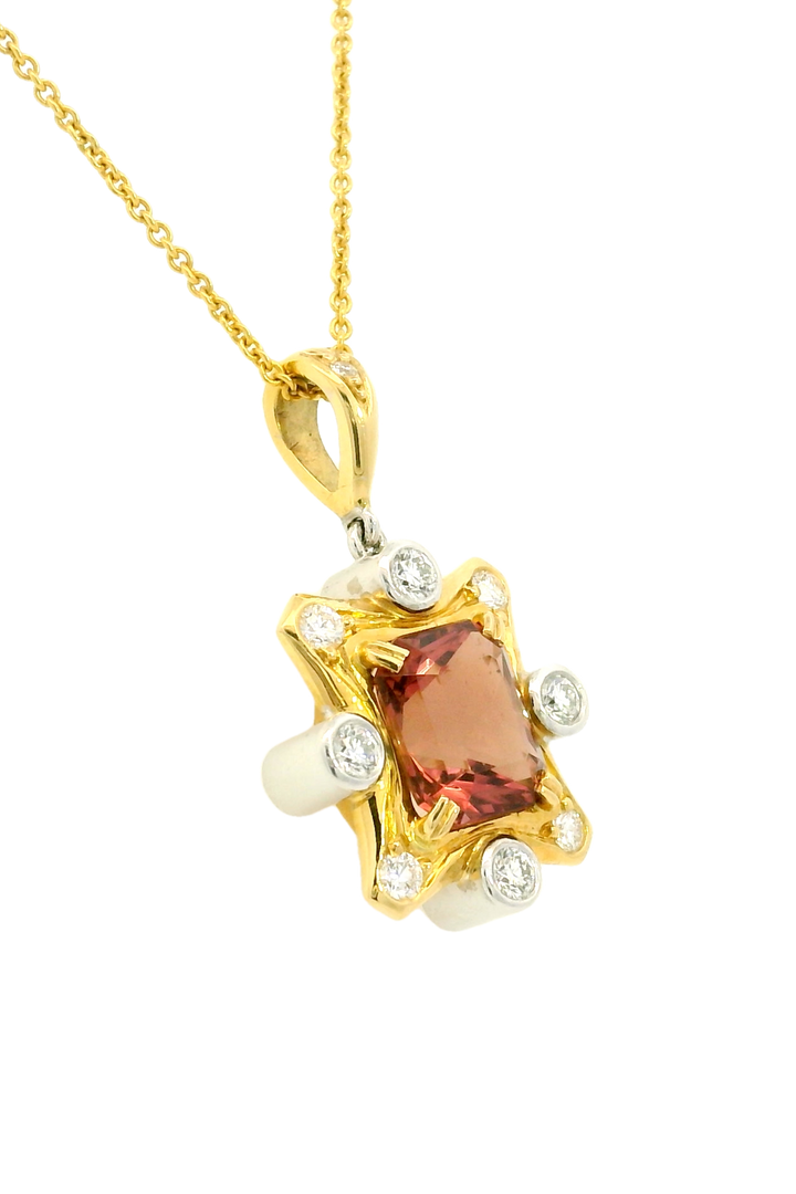 Grace meets sophistication, with this 18ct yellow and white gold tourmaline and diamond pendant. Centrally set with a 2.40ct peach tourmaline and uniquely framed with 8 round brilliant cut diamonds, weighing a total of 0.31ct. Adding that extra sparkle, the bail is also set with a single diamond.