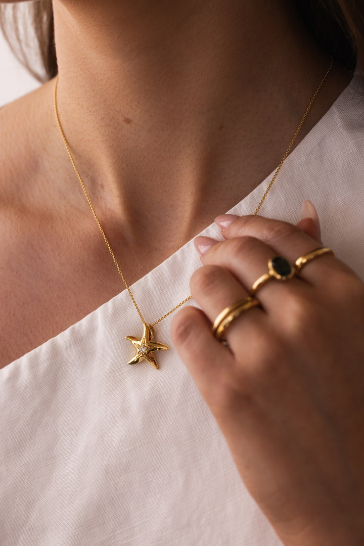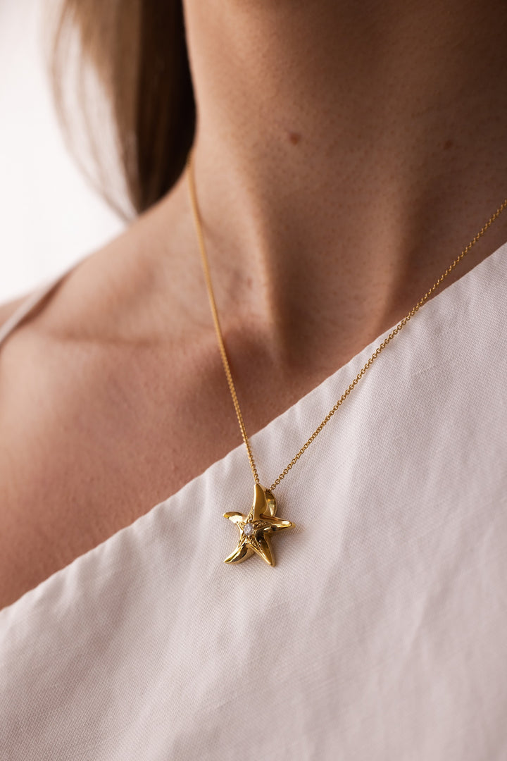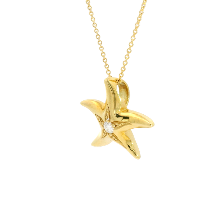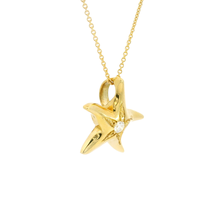 Memories of hot summer days and rockpools come rushing in with this 18ct yellow gold starfish pendant. Handmade in our on-site workshop and grain set with 1=0.09ct FG/VS-SI round brilliant cut diamond.