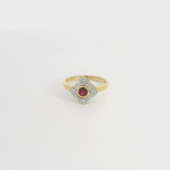 Handcrafted 18ct yellow & white gold ruby & diamond ring. The ring consists of 1 round ruby = 0.33ct set into 18ct yellow gold rub over setting. Set around the ruby in 18ct white gold square setting are 4 round brilliant cut diamonds = 0.08ct FG/SI bead set with mill grain edge.