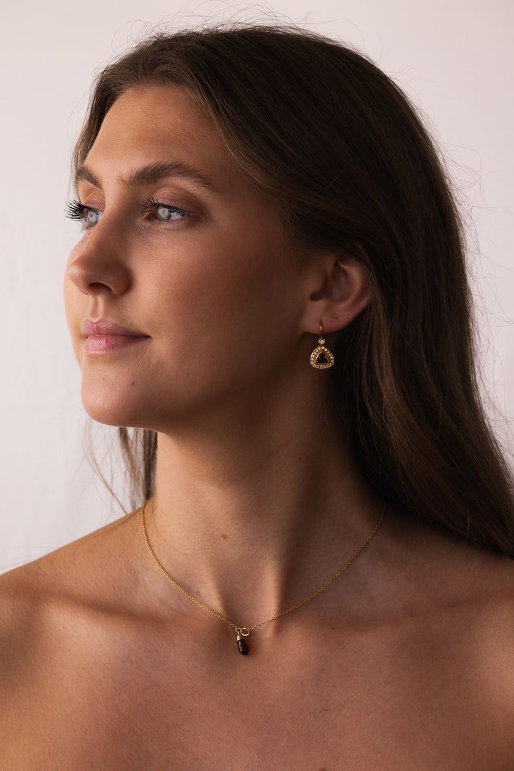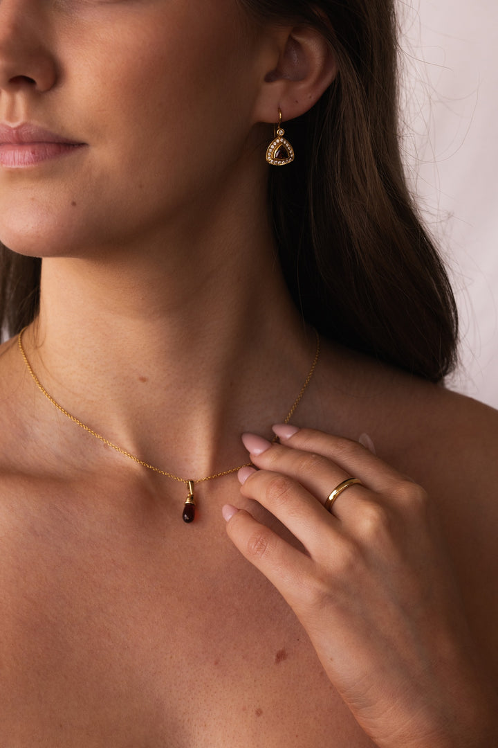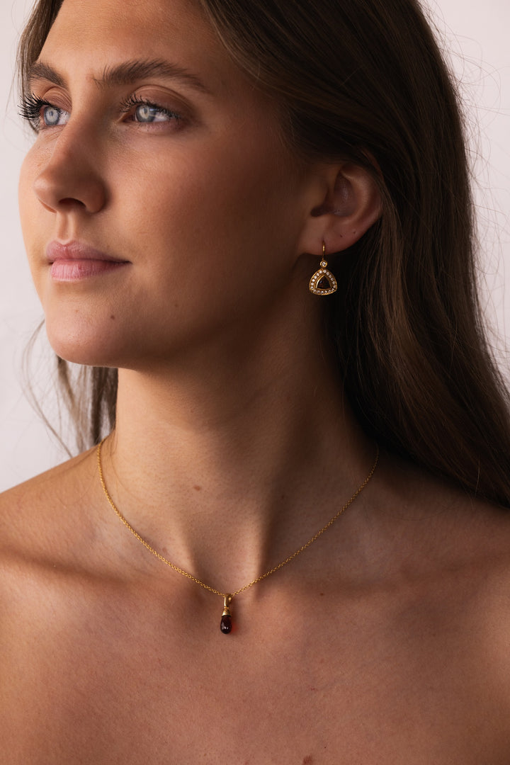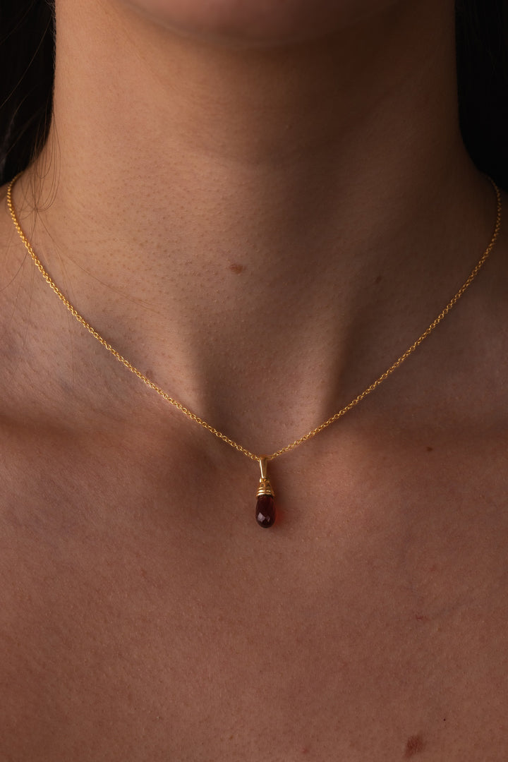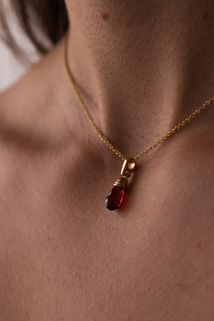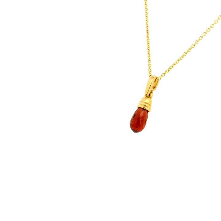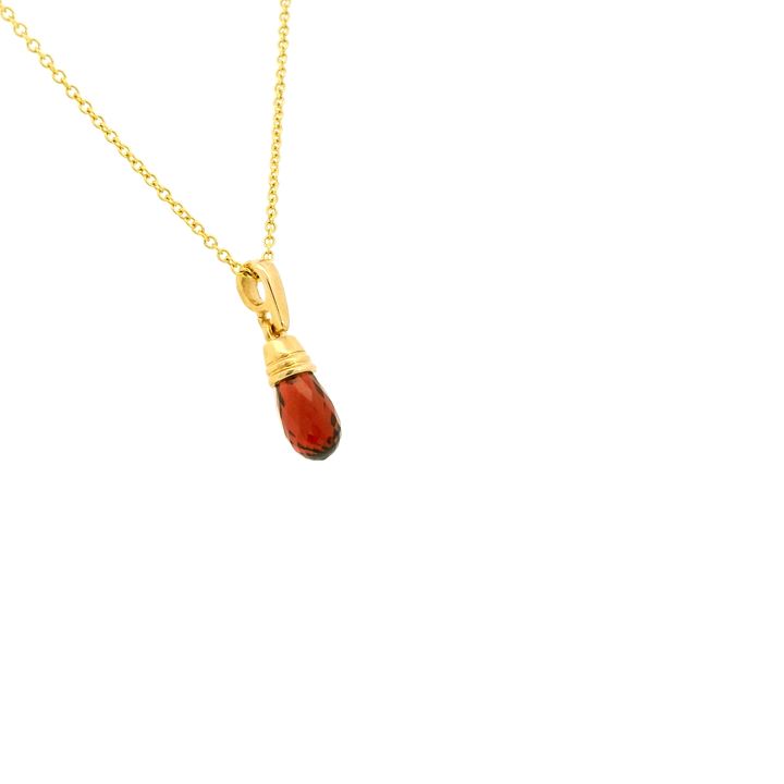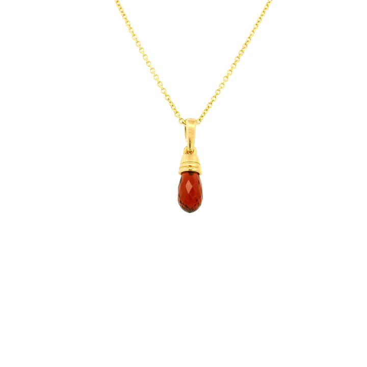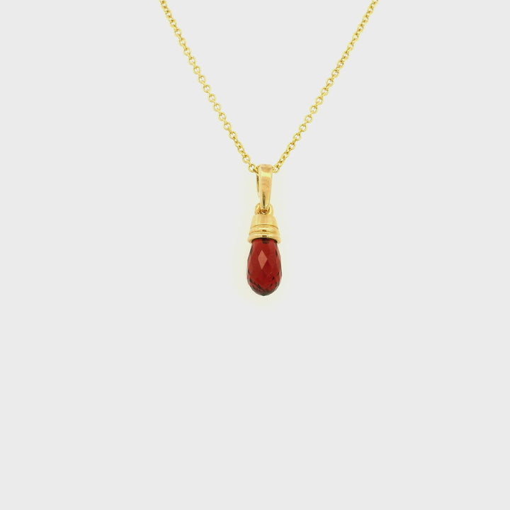 This delicate 9ct yellow gold pendant is set with a vibrant red briolette Garnet, measuring 10mm in length. This Garnet is connected to a fancy cap, resting on a polished bail. Perfect for your fine gold chain, or select a new chain from within our Milton based store today.