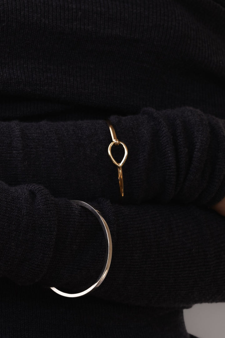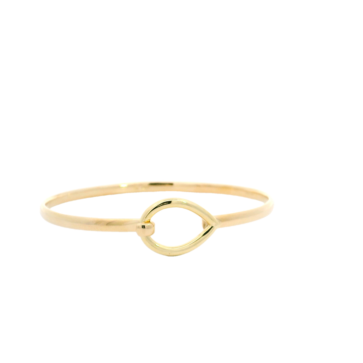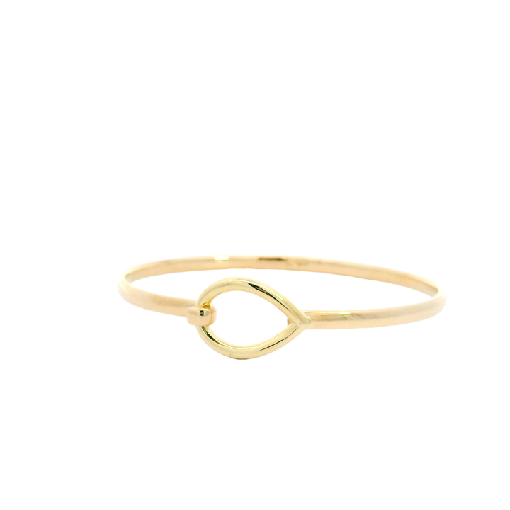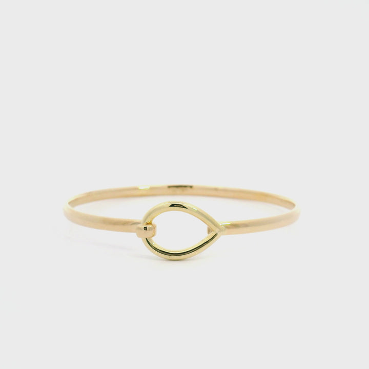 Handmade in 9ct yellow gold, this oval shaped bangle features a teardrop design and measures 61.5mm inner diameter. This elegant bangle has been designed with a clasp to allow for ease of use.