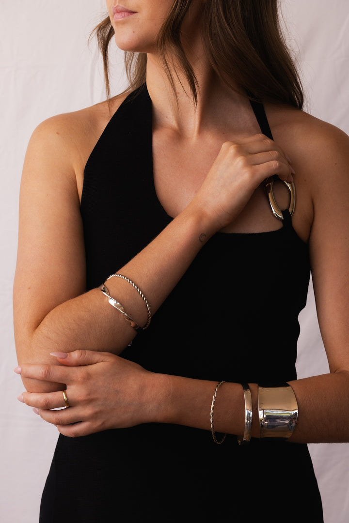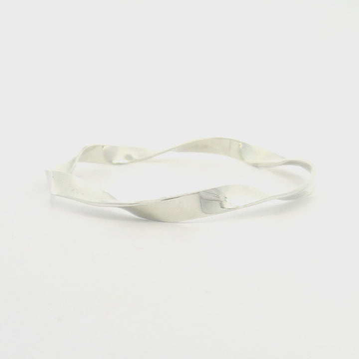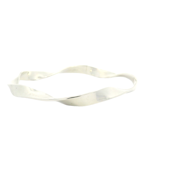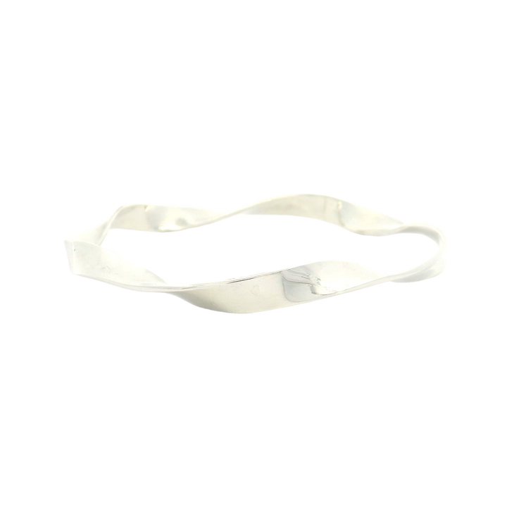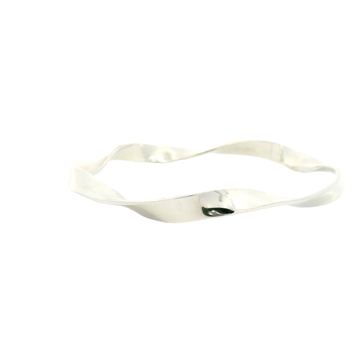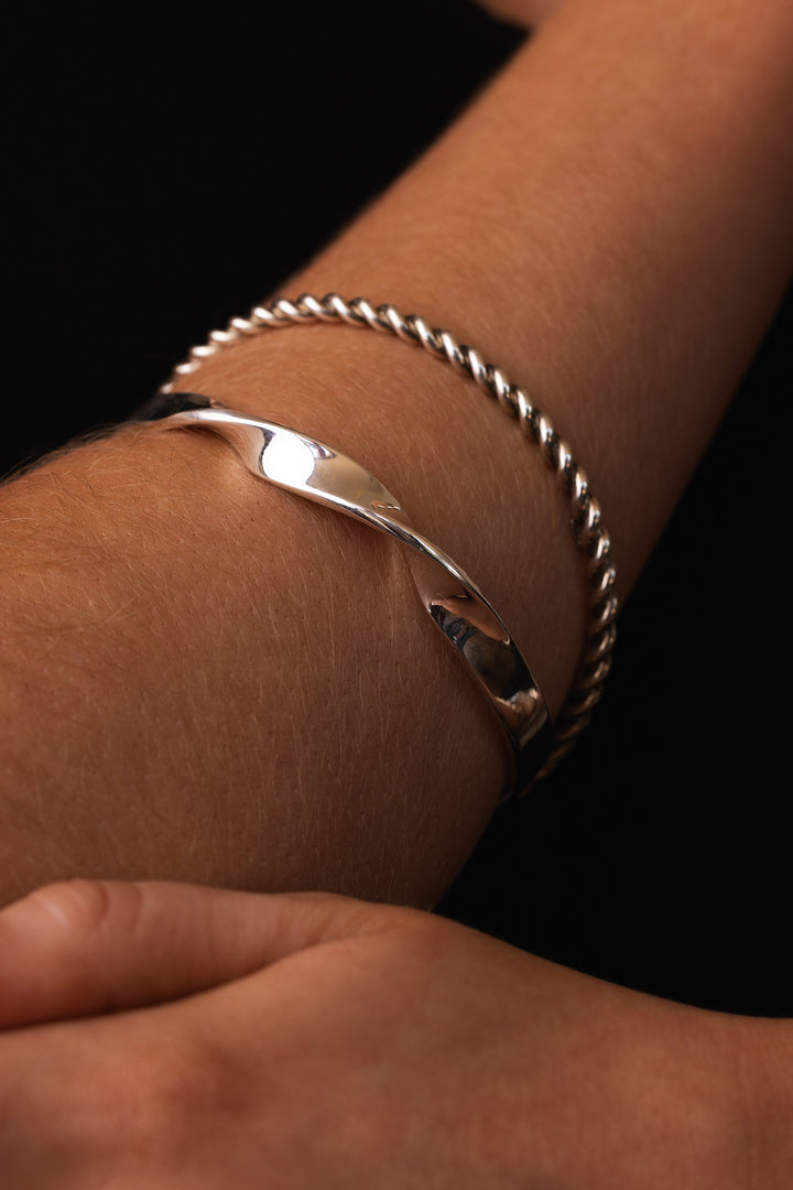 This sterling silver open twist bangle speaks style and charm. Handmade in our on-site workshop, this highly polished bangle features a flat profile and measures 6.3mm wide, with an inner diameter of 69mm.